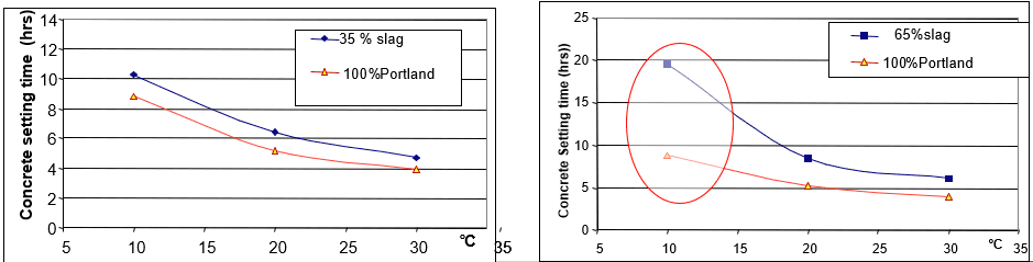 Nhiệt độ ảnh hưởng đến thời gian đông kết của xi măng xỉ.
