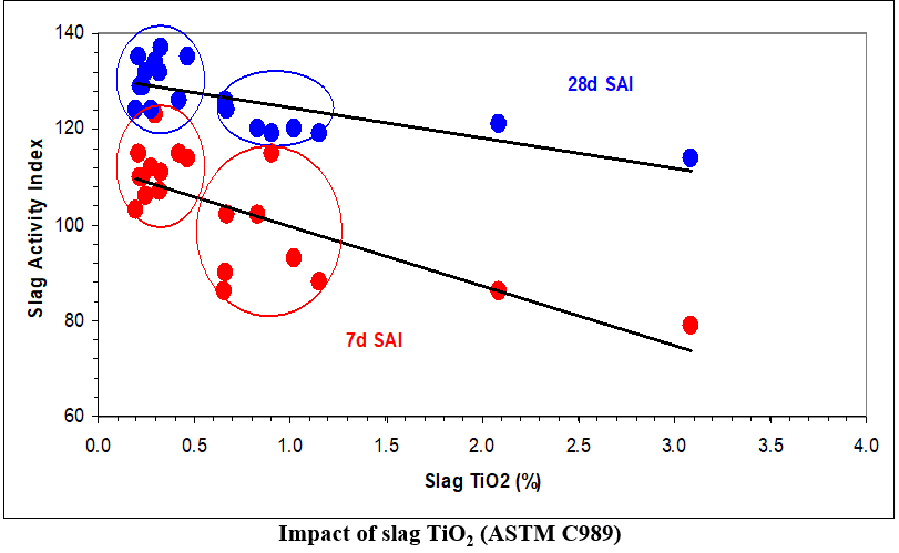 Các thông số hóa học của xỉ làm giảm sự phát triển độ bền của xỉ là: TiO2, SiO2